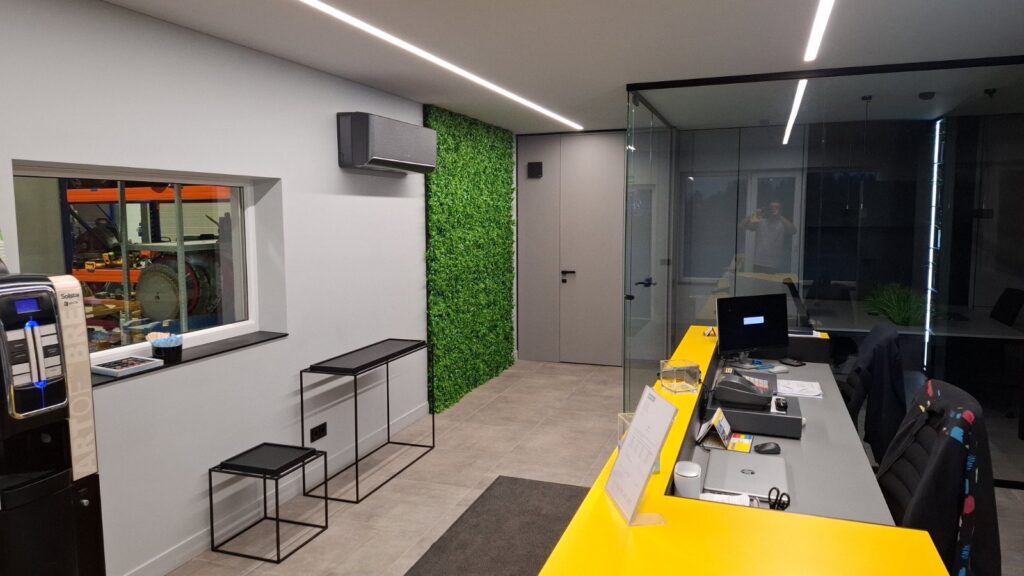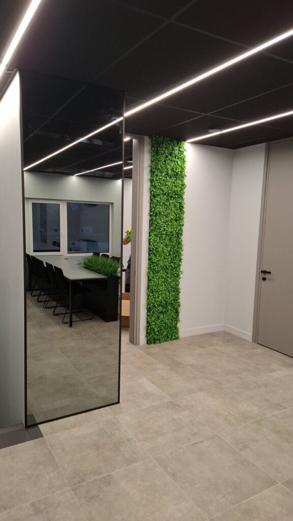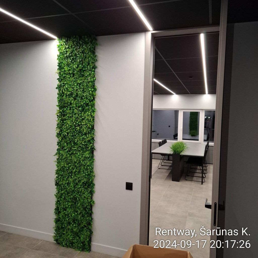Profesionalūs statybinės įrangos pardavėjai ir nuomotojai RENTWAY besirūpindami savo darbuotojų gerove atnaujino biuro patalpas pagyvindami jas dirbtinių augalų siena. Pasirinkta dirbtinių augalų siena PEPEROMIJA